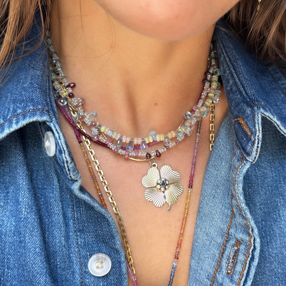 Get ready to sparkle with our opal and blue topaz necklace! A must-have for any jewelry collection, this stunning piece is perfect for October or august birthdays (or anyone who loves opals). This adds a captivating amount of dimension and texture to any necklace stack. Comes with a detachable extension chain.